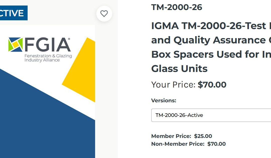 El documento IGMA TM-2000-26, Métodos de Ensayo y Criterios de Control de Calidad para Espaciadores de Caja Usados ​​en Unidades de Vidrio Aislante, de la FGIA, ya está disponible para su compra en la tienda en línea de la FGIA. Este documento se actualizó por última vez en 1982.